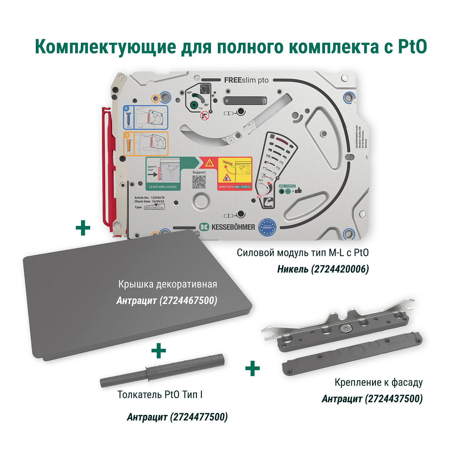 Полный комплект ультратонкого подъемного механизма ФриСлим ФЛАП Kesseböhmer c толкателем PTO тип I для накладного монтажа, цвет АНТРАЦИТ