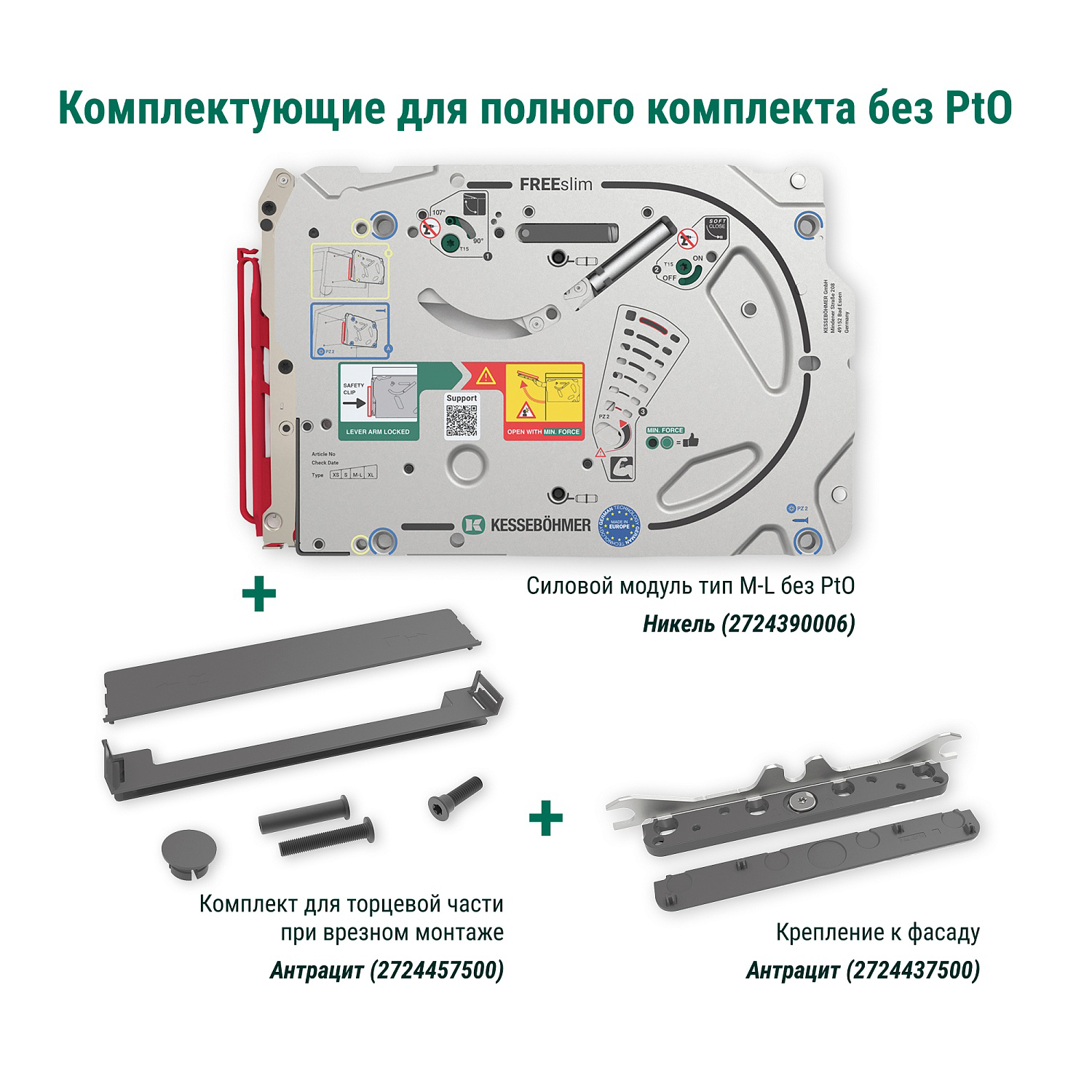 Силовой модуль тип M-L левый и правый, к подъемнику ФриСлим Флап, H 225-650, 2 шт + 4 установочных штифта, 8 шурупов 4х20 мм, цвет НИКЕЛЬ (2724390006)