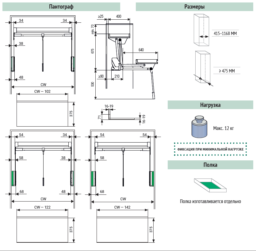 Общая нагрузка на механизм включает в себя: полезная нагрузка + собственный вес механизма 2 кг (максимальный вес ручки-тяги и штанги для одежды).